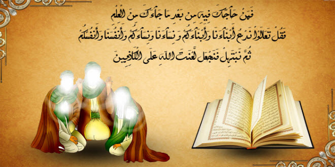 قوله تعالى: (فَمَنْ حَاجَّكَ فِيهِ مِنْ بَعْدِ مَا جَاءَكَ مِنَ العِلْمِ فَقُلْ تَعَالَوْا نَدْعُ أَبْنَاءَنَا وَأَبْنَاءَكُمْ وَنِسَاءَنَا وَنِسَاءَكُمْ وَأَنْفُسَنَا وَأَنْفُسَكُمْ ثُمّ نَبْتَهِلْ فَنَجْعَلْ لَعْنَةَ اللهِ عَلَى الْكَاذِبِينَ)(1) .